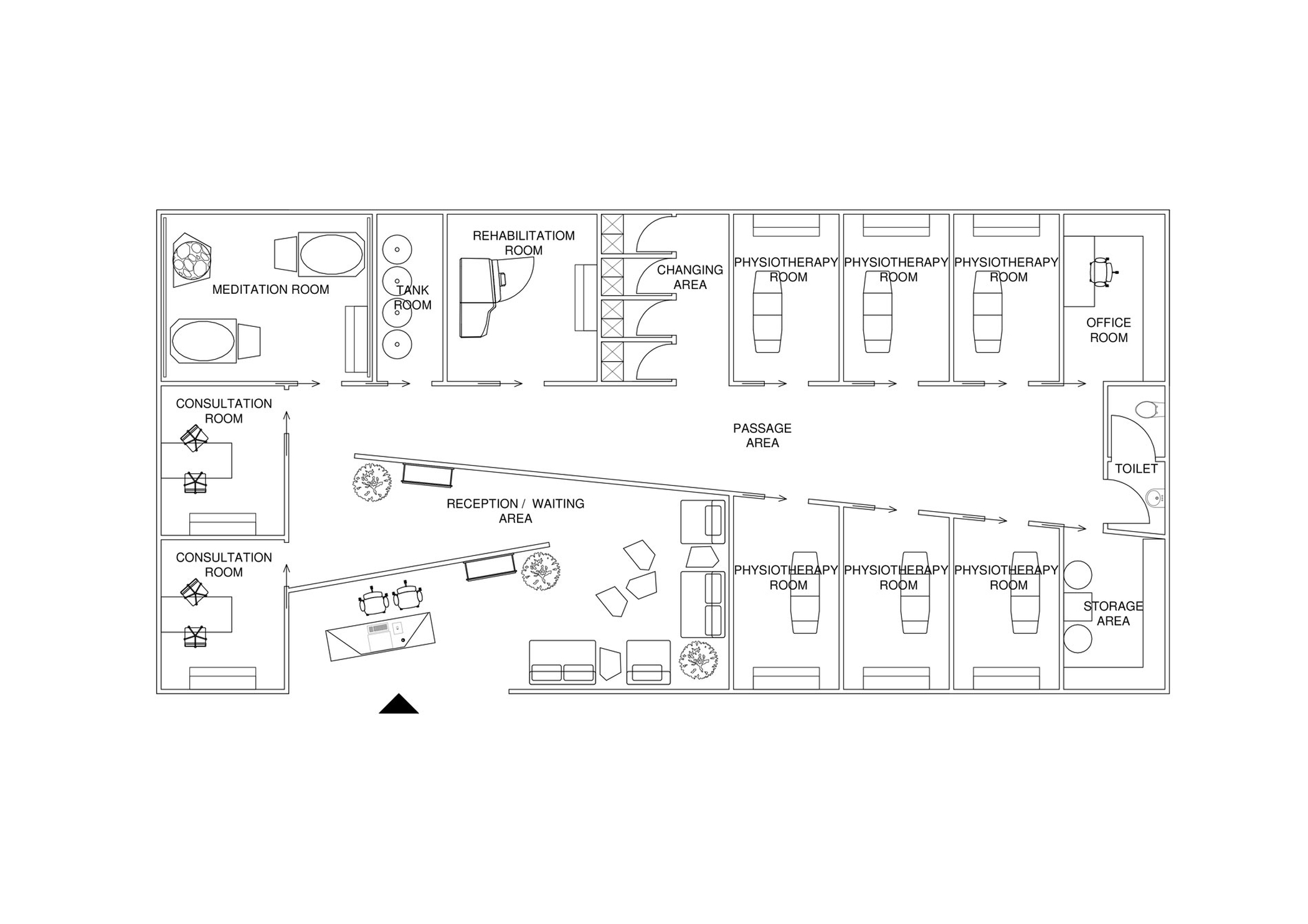 Układ strefy wejścia, recepcji i poczekalni jest bardzo dynamiczny. Ściany usytuowane są pod kątem, nawiązując do pęknięć w lodzie. Także hol prowadzący do pokoju konsultacji, przebieralni oraz pomieszczeń zabiegowych jest zaprojektowany pod różnymi kątami. Pomimo tego układ jest łatwy do odczytania i odnalezienia się przy pierwszej wizycie. Wszystkie czynności i procedury zabiegowe zostały przewidziane w planie funkcjonalnym, tak aby ułatwić użytkowanie. W ramach współpracy zaprojektowane zostały także meble gabinetowe oraz pomocnicze.